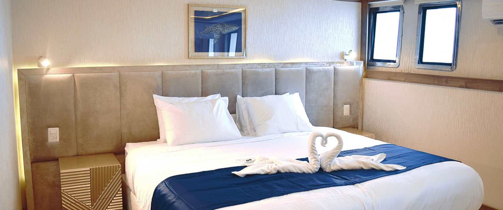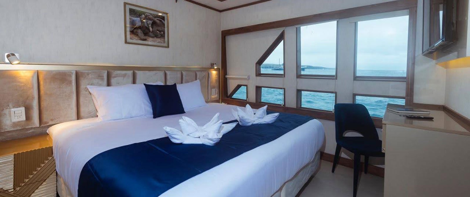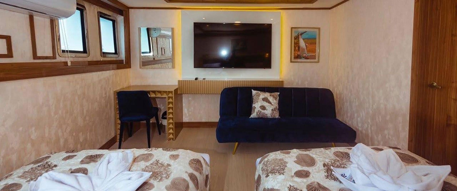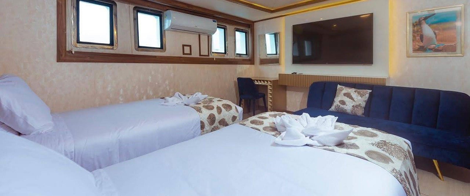 These air-conditioned cabins are located on the main deck and each have ocean views and private bathrooms. All the cabins are furnished with two single beds that can convert to queen beds, catering to singles or couples.