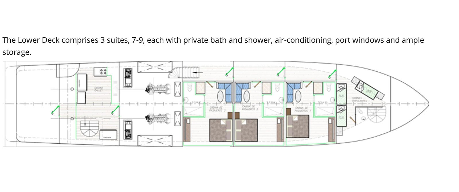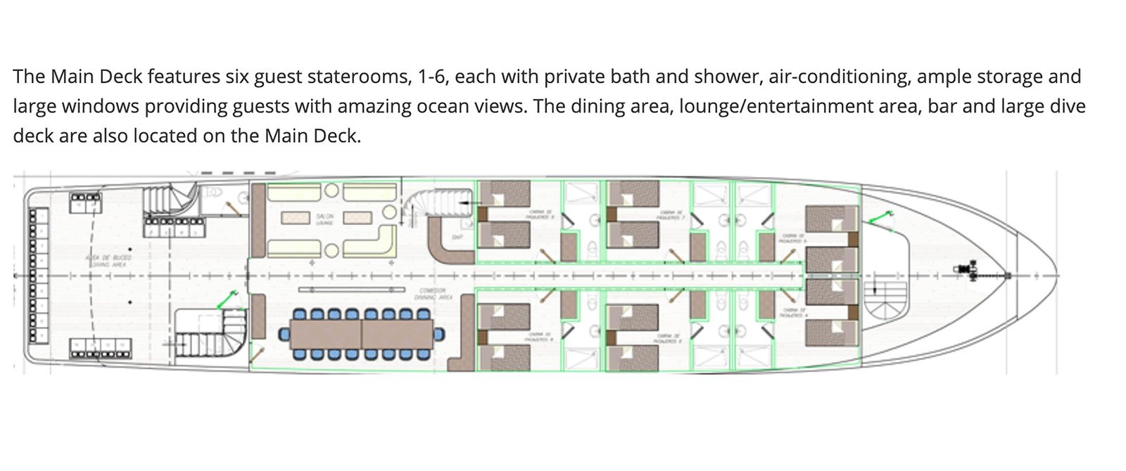 The main deck cabins have large windows providing stunning ocean views. In addition, each stateroom has twin beds that can be converted to comfortable queen beds for couples, and include private en-suite bathroom, dressers, closets with ample storage space.