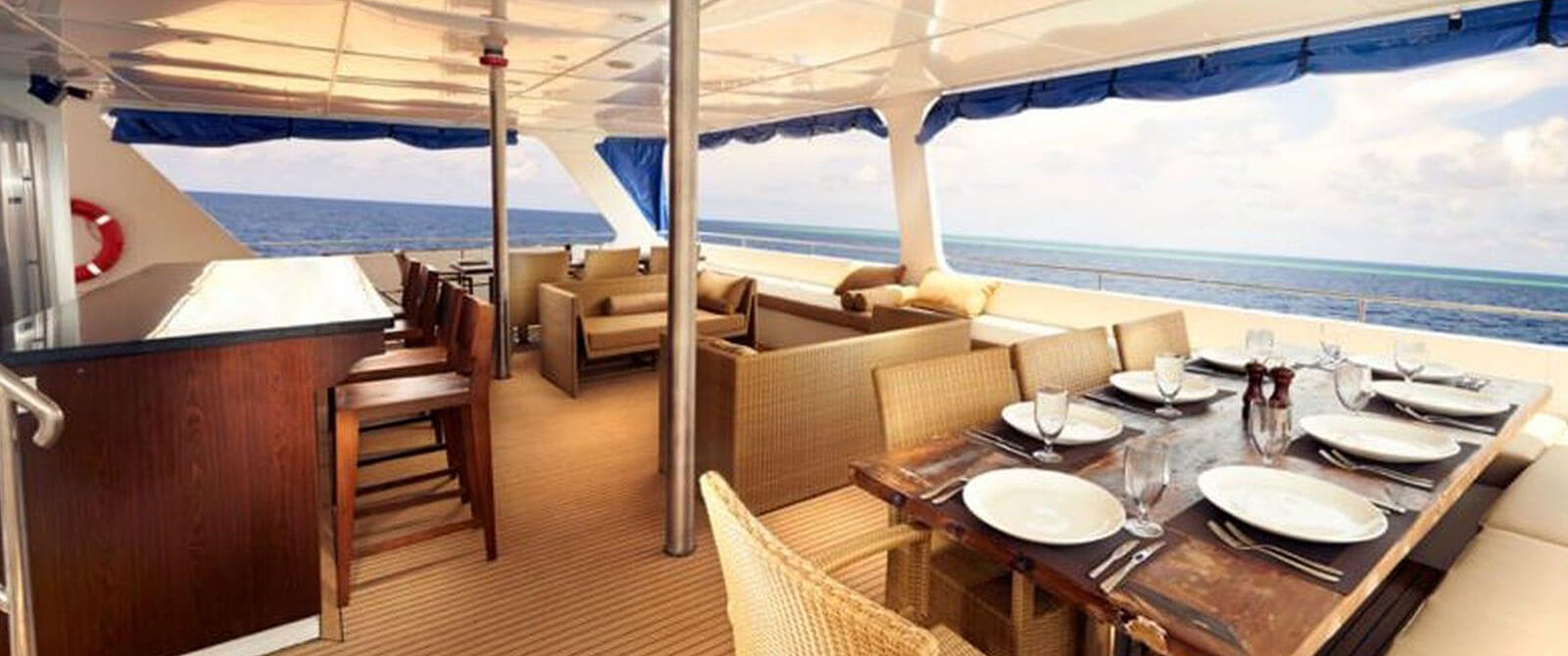 The Blue Manta features 14 spectacular cabins. The size of each cabin is approximately 20 square meters and comes with an en suite bathroom and air conditioning. The three chefs on board the Blue Manta liveaboard make five meals a day. Each day starts with delicious and freshly baked bread. Cuisine selections include Western food and local food, served buffet style. Al fresco dining is also available.