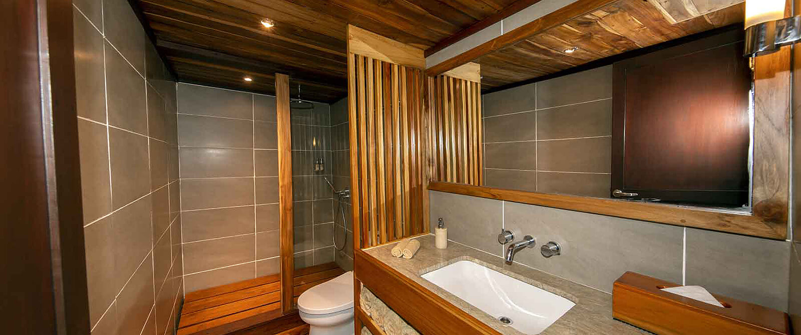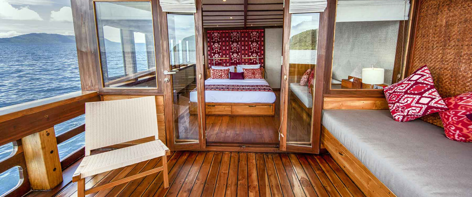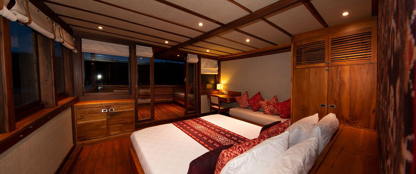 Master Cabins (Double bed 180 X 200 cm.) are on the main and are spacious and airy with private deck and a total of 30 m² space. Each cabin is air-conditioned, non-smoking, environmentally friendly, natural soap and shower amenities are provided free of charge. All cabins have their own bathrooms with warm freshwater showers, towels and hairdryer and are tastefully decorated, incorporating traditional design elements with modern features. The luxurious master cabins additionally feature each a private balcony, sun chair and outside sofa, where guests can indulge in the tropical scenery and never miss a sunrise or sunset. The housekeeping will make up your cabin daily and also do a turn-down service in the evenings.