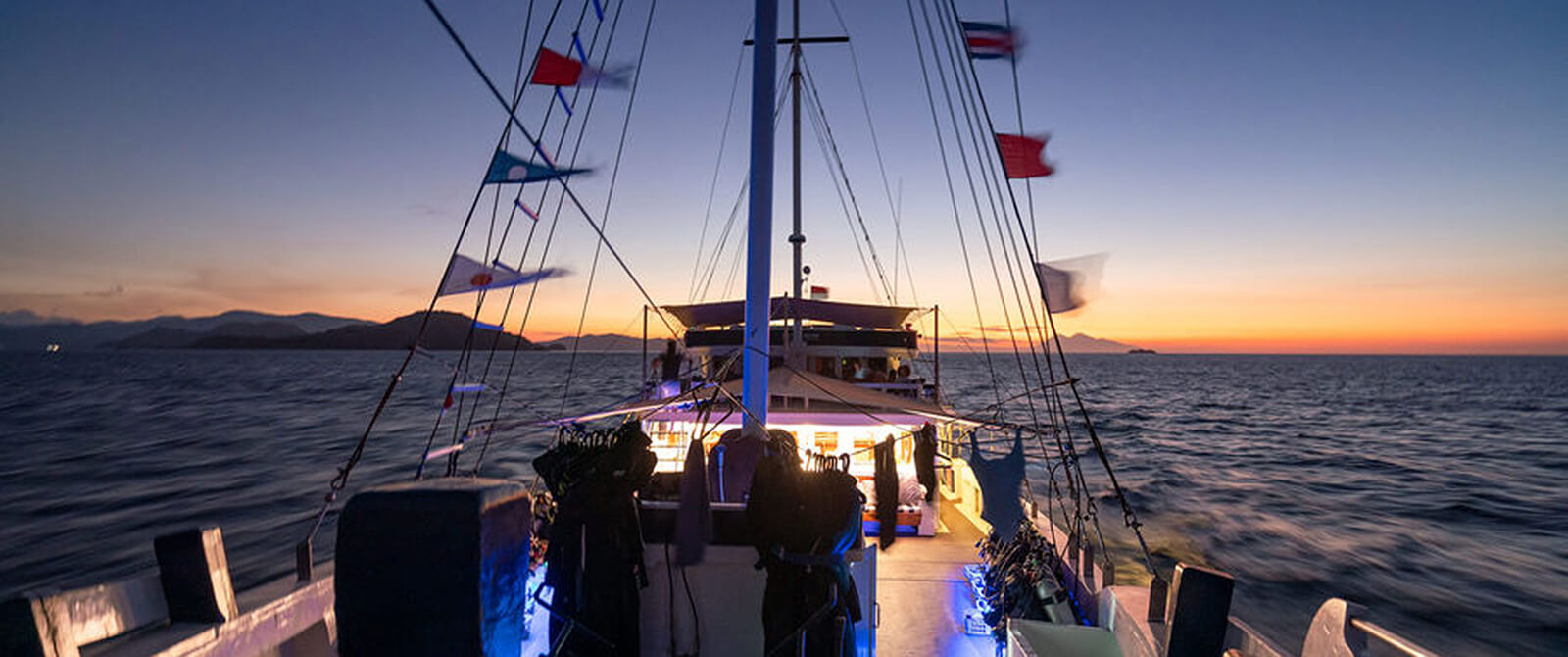 A hearty meal is served after the first dive, and there is downtime between dives to relax. There is a break in the action after the second dive for lunch and a brief nap in the afternoon. A delicious dinner is prepared after the night dive. To complete the day, perhaps a glass of wine while gazing at the sky, followed by a restful night's sleep.