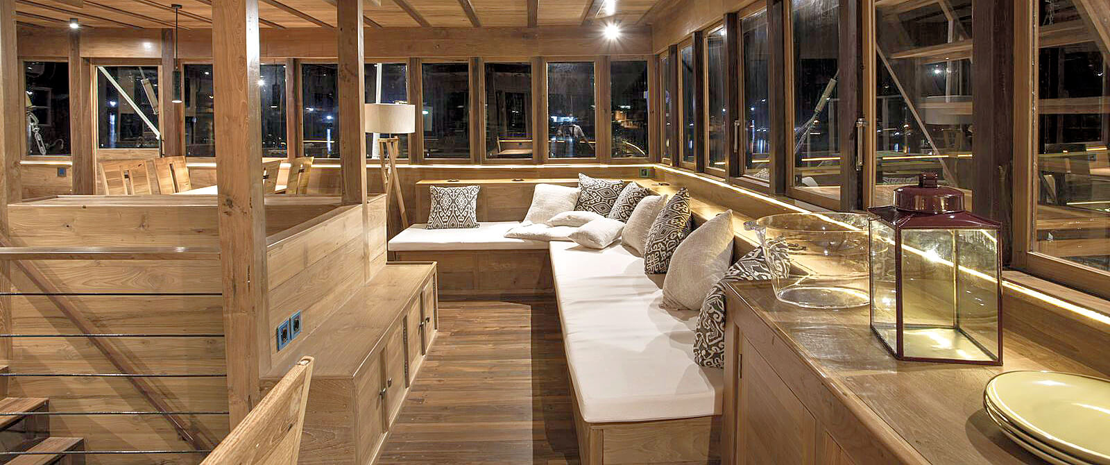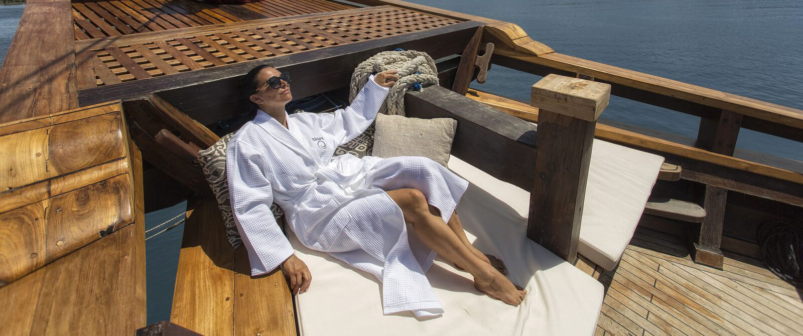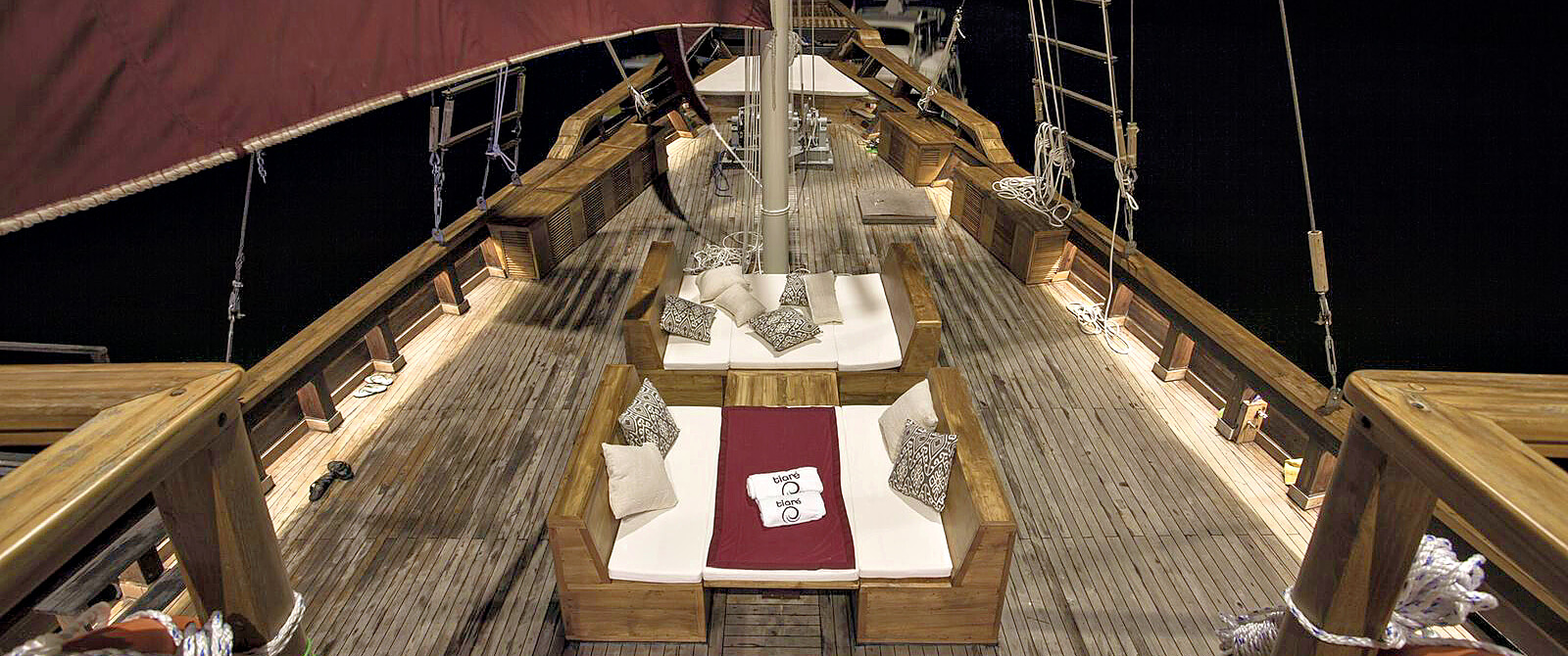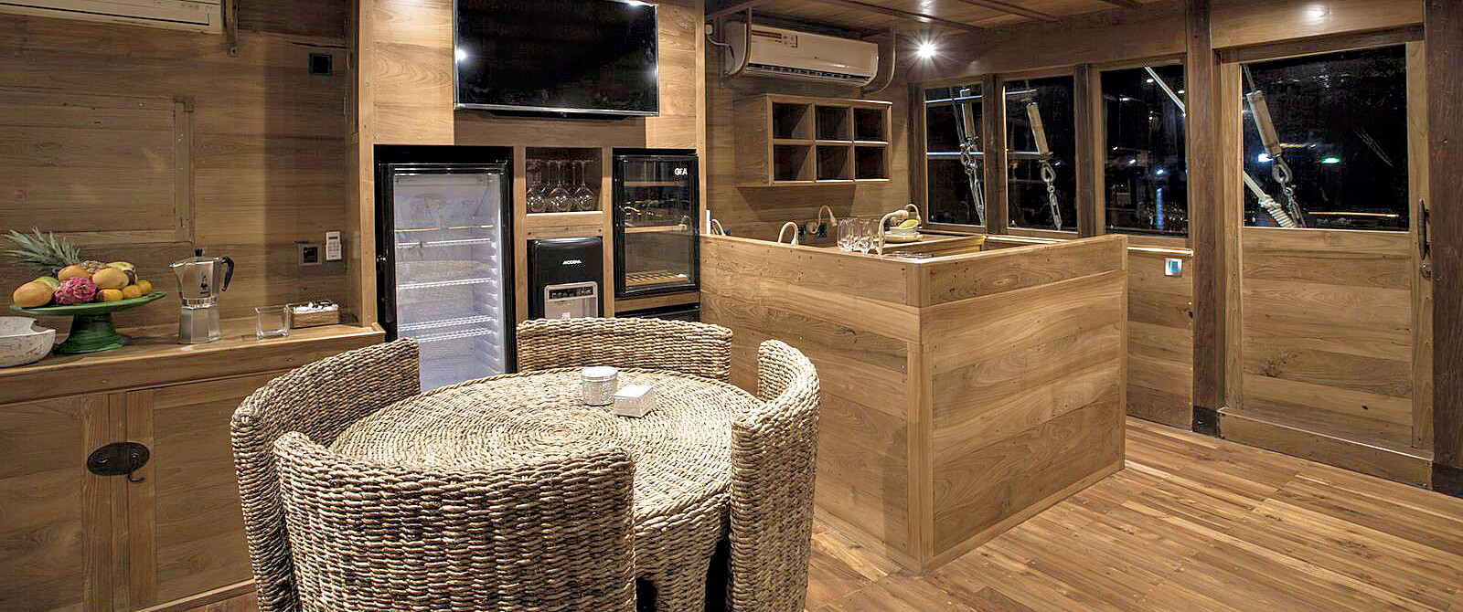 All indoor and outdoor living areas, decks and cabins are made with antique teak salvaged from old Joglos, that give the feel of “real Indonesia”. With six Deluxe, airy cabins of 13 sqm each and suited to a maximum of fourteen guests in 2 Twins and 4 Double Cabins (convertible to twins) and 2 of which have an additional Single bed, ideal for a family with a child or 3 friends.