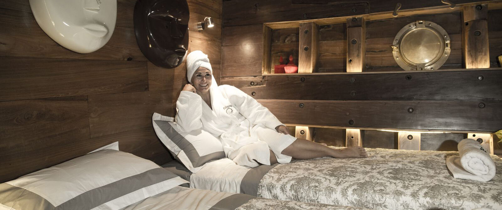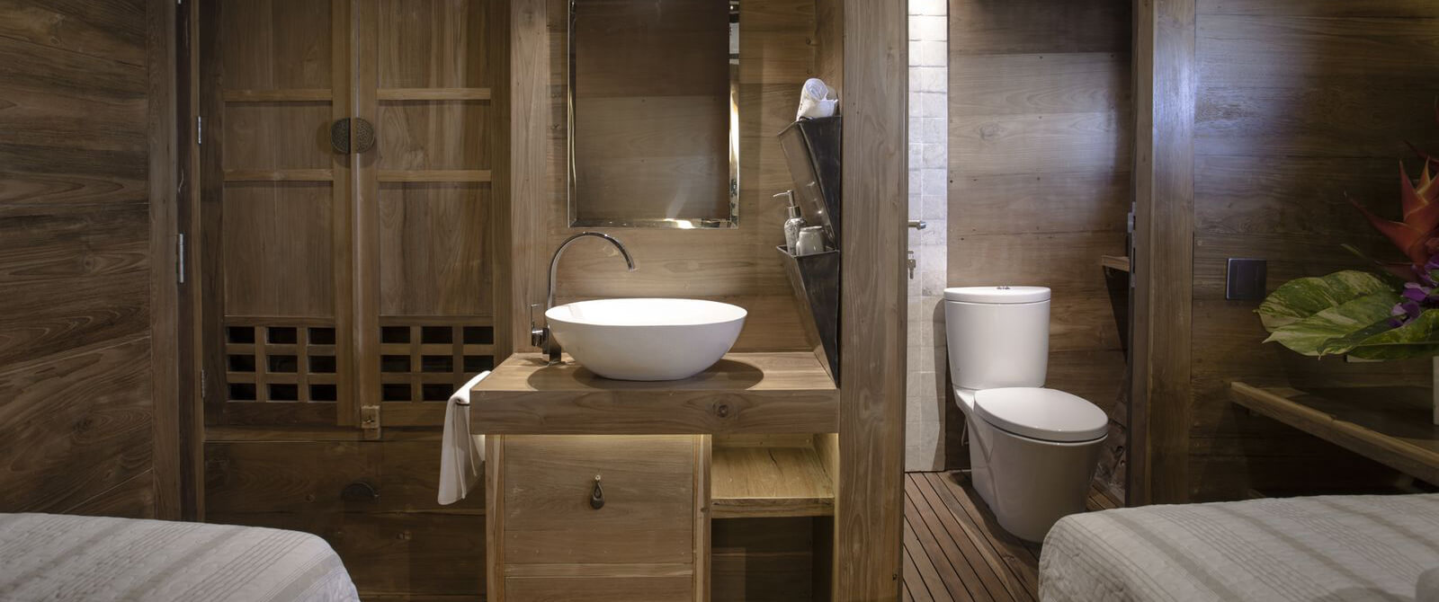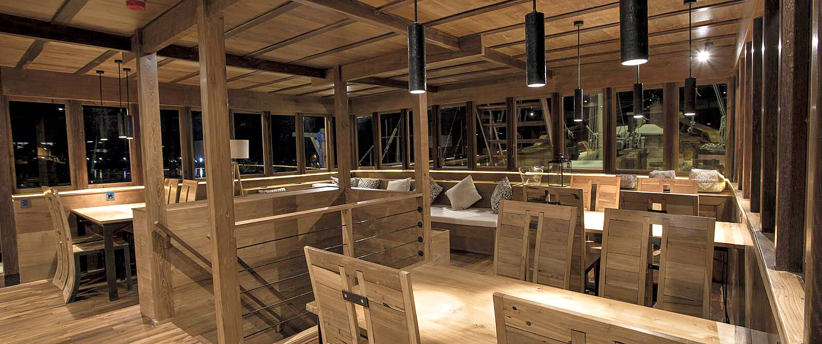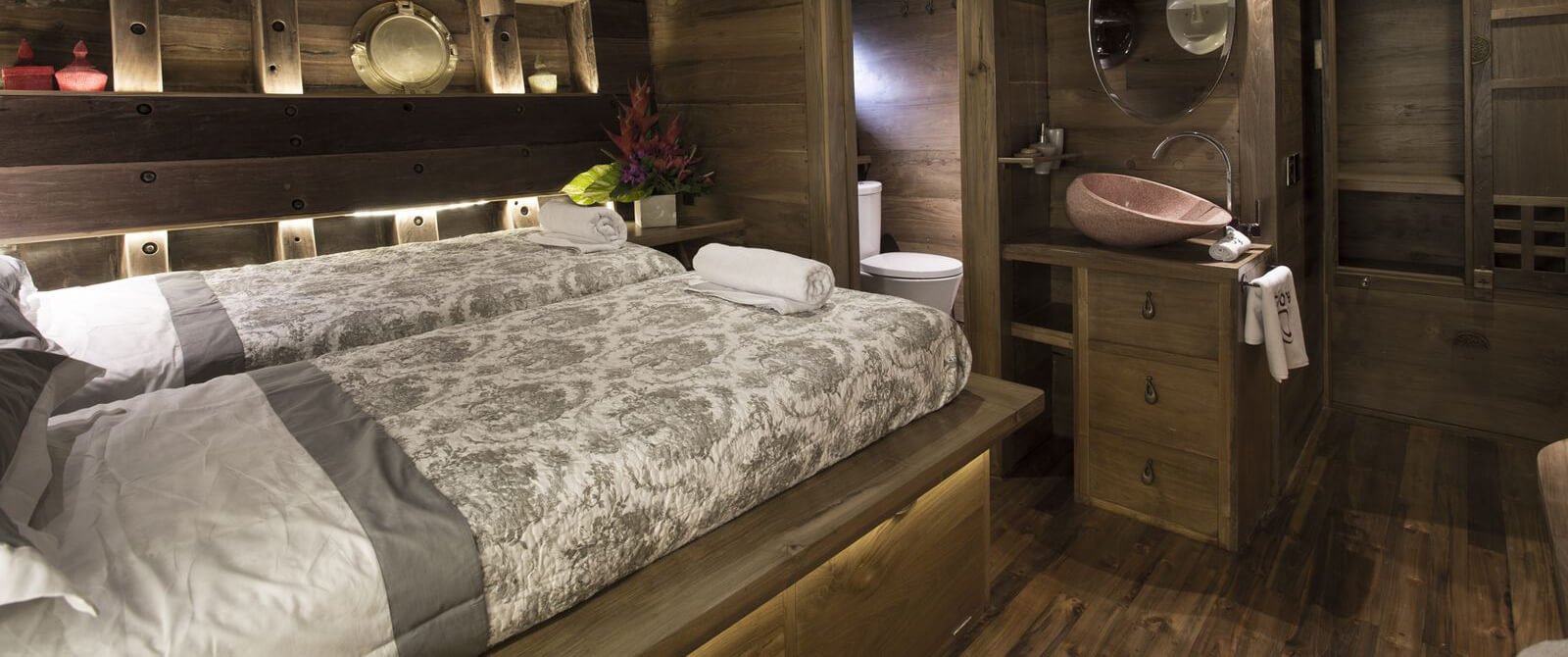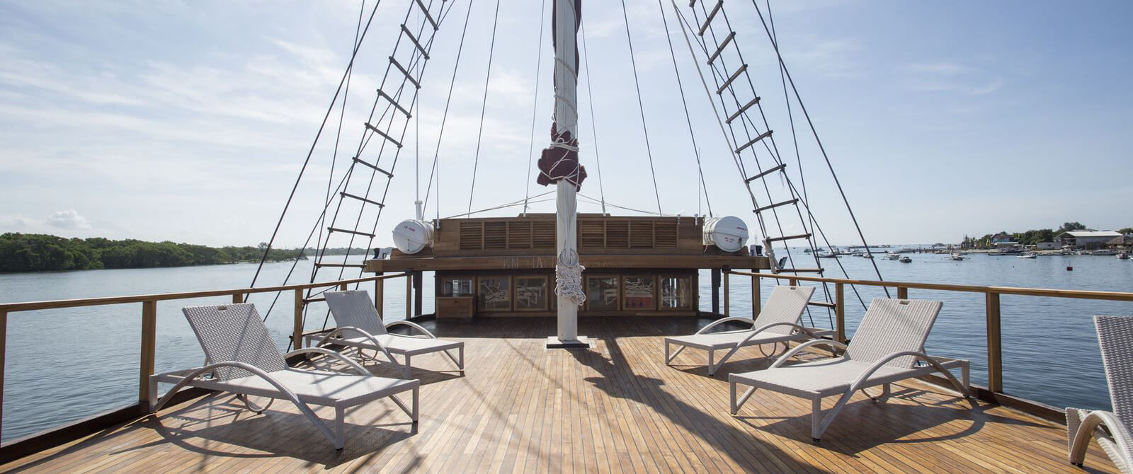 All indoor and outdoor living areas, decks and cabins are made with antique teak salvaged from old Joglos, that give the feel of “real Indonesia”. With six Deluxe, airy cabins of 13 sqm each and suited to a maximum of fourteen guests in 2 Twins and 4 Double Cabins (convertible to twins) and 2 of which have an additional Single bed, ideal for a family with a child or 3 friends.