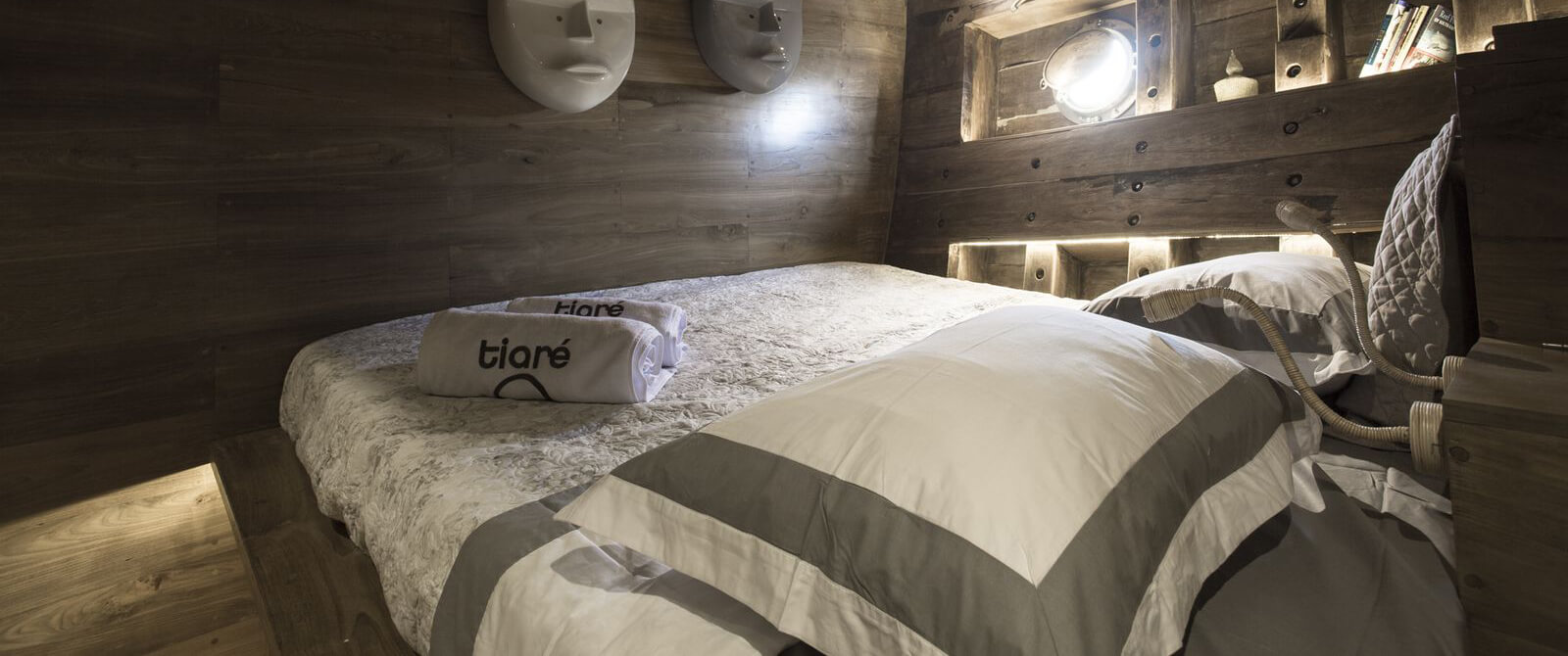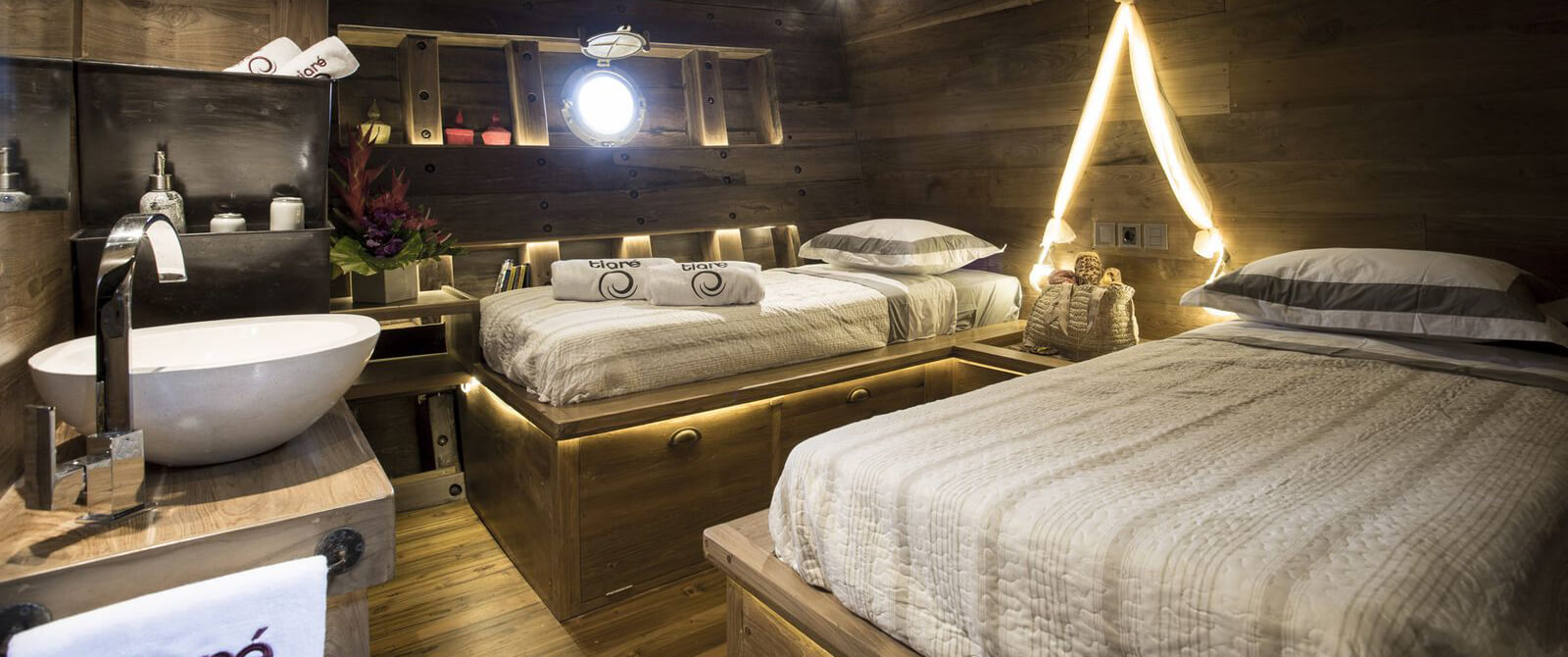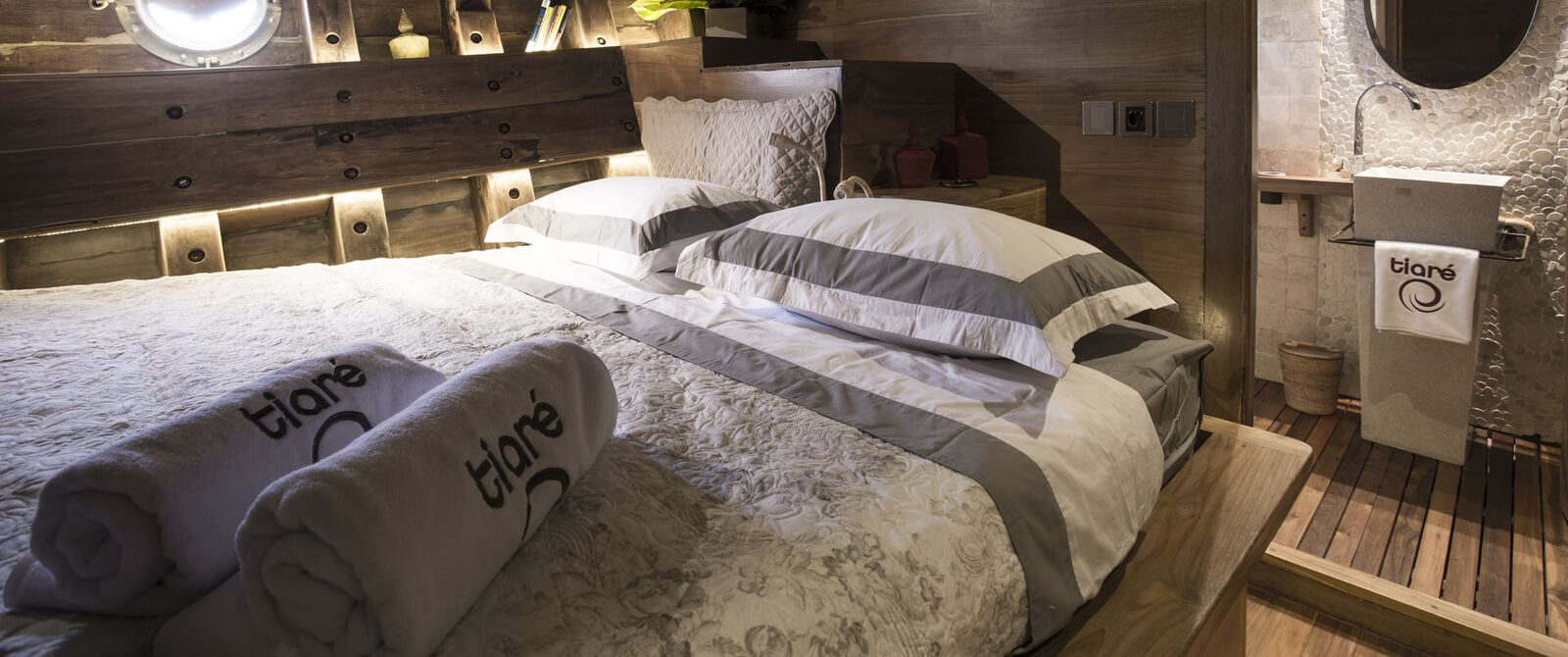 You’ll enjoy soft linens and well thought out lighting and plug placement as well as spacious en-suite bathrooms, hot water showers and environmental friendly body wash and shampoo. Four king size, pitcher of fresh water and glasses, shampoo, body milk, hair dryer, shore set (hat, towel, suntan lotion, thermos),2 combs, mosquito repellent, fire detector system, air con, two triple cabins are spacious enough to accommodate two adults and one child or three adults, with under-bed storage. Kindly note Tiaré does not guarantee same sex cabin share for single travelers. Although they always do the best to put same sex guests in the same cabin when they have even number of single travelers.