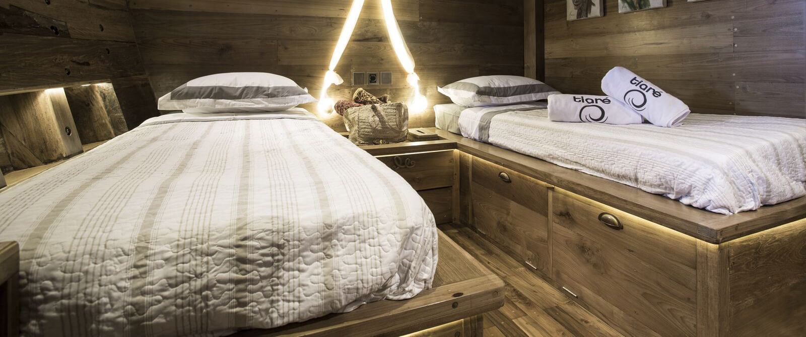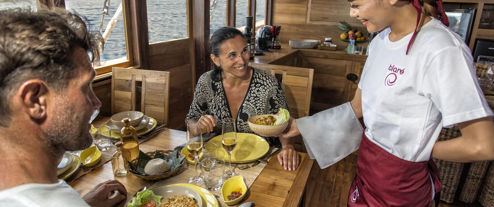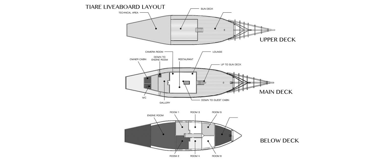 You’ll enjoy soft linens and well thought out lighting and plug placement as well as spacious en-suite bathrooms, hot water showers and environmental friendly body wash and shampoo. Four king size, pitcher of fresh water and glasses, shampoo, body milk, hair dryer, shore set (hat, towel, suntan lotion, thermos),2 combs, mosquito repellent, fire detector system, air con, two triple cabins are spacious enough to accommodate two adults and one child or three adults, with under-bed storage. Kindly note Tiaré does not guarantee same sex cabin share for single travelers. Although they always do the best to put same sex guests in the same cabin when they have even number of single travelers.