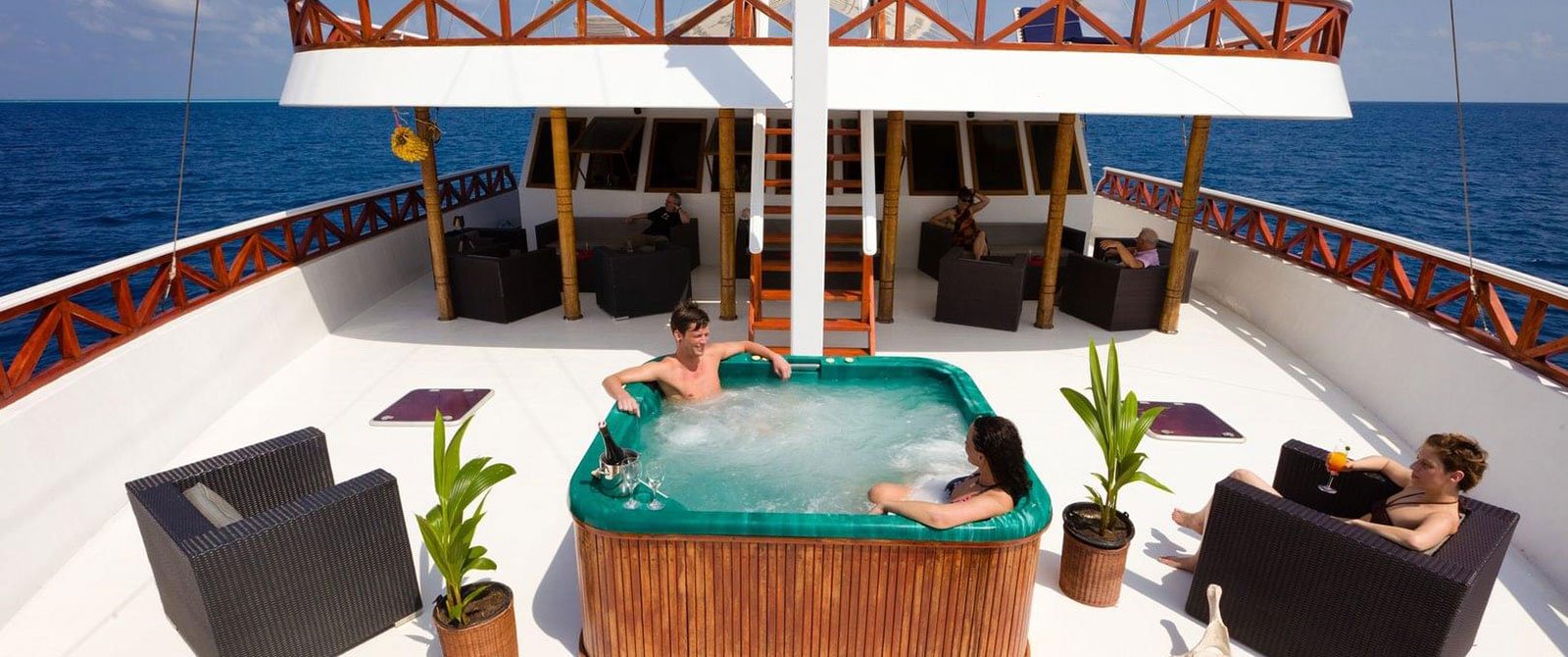 There is plenty of room to relax whilst onboard the Nautilus Two. Meals are served in the parlour, where a dhoni is used as a buffet table for food presentation varied menu of local specialties and delicious European and Asian cuisine. The bar offers cold beer on tap and a wide selection of red and white wines and spirits. Fuel up sunshine on the huge sun deck, relax in the jacuzzi or on a comfortable lounge chair in the shade while the Nautilus Two brings you to the next destination of your dive trip in the Maldives.