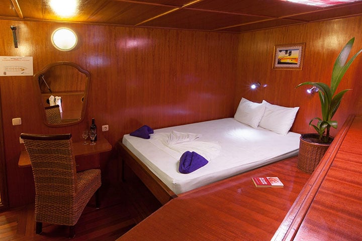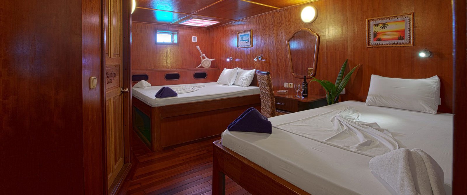 - The 141 feet (43m) Nautilus Two liveaboard caters to up to 24 guests in 12 cabins. With an average cabin size of 20 m², each spacious cabin has a kingsize double bed, a single bed, desk, mirror, large closet, wardrobe, shelves, and air conditioning. There is also a private en-suite bathroom with a massage shower. The cabins are booked only for double occupancy.