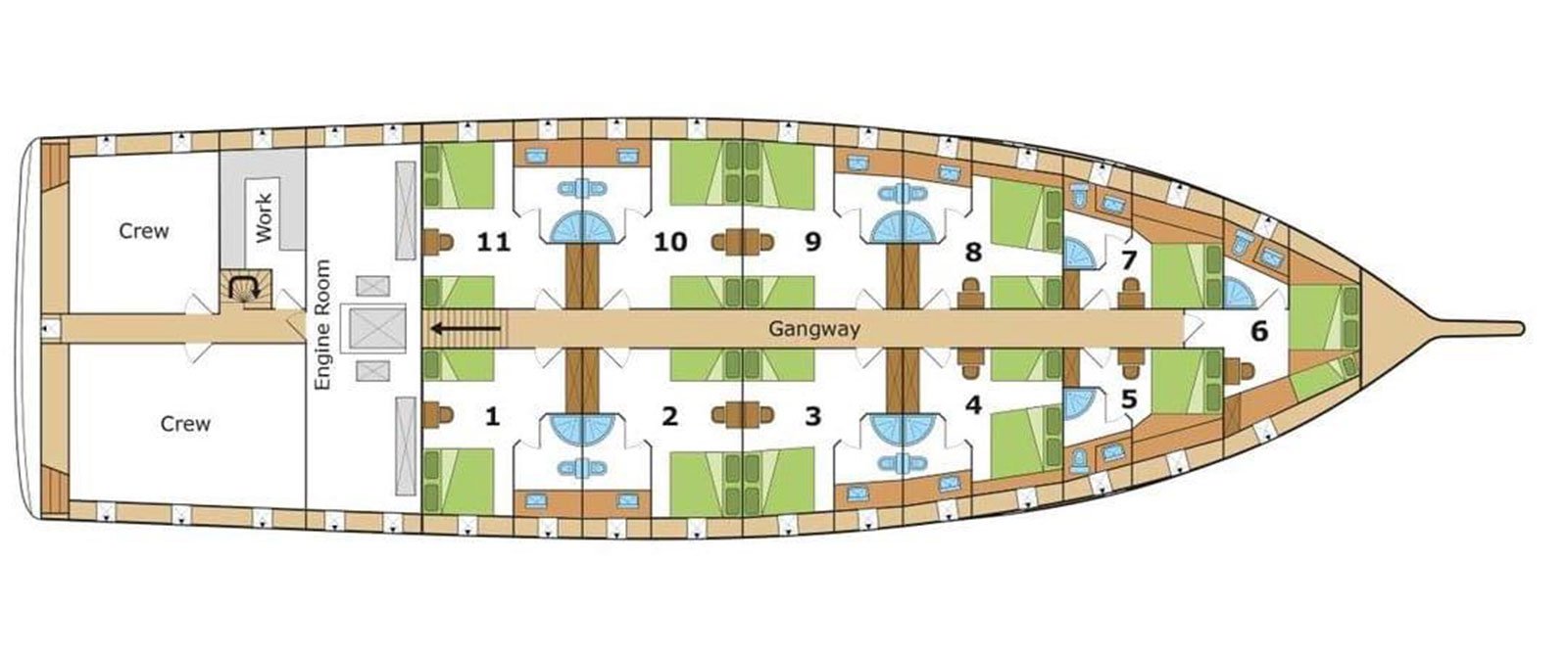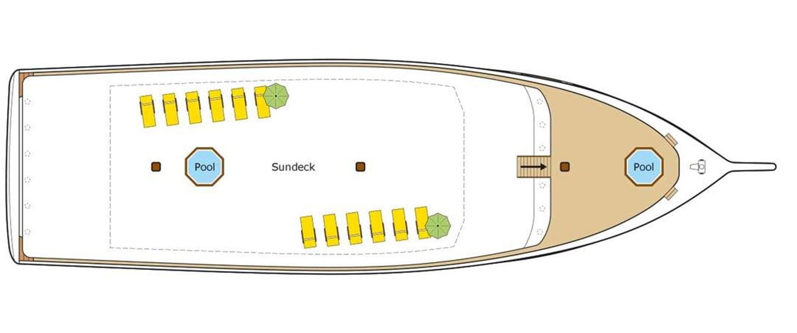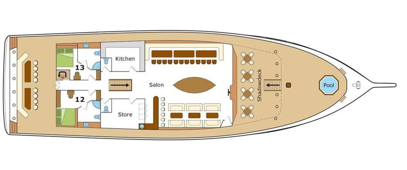 The cabin is spacious at 20-25 m². All 12 cabins have identical design and are equipped with a king size double bed and a king single bed. However, the cabins are booked only for double occupancy. Ten of the cabins are located below deck and two on the middle deck. All cabins have their own approximately 6 m² large bathroom with side window. Each bathroom has a large vanity with mirror, a luxurious massage shower and a flush toilet. 2 towels per person are provided.