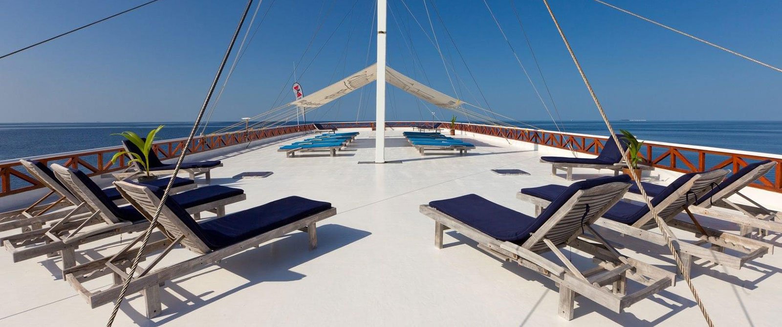 Divers are taken care of from the dedicated diving dhoni. All the compressors are located here, ensuring a quiet night's sleep aboard the mother ship. The dhoni is spacious and offers enough individual storage space for all divers. Nitrox is available upon request and the dhoni will remain nearby during all dives for added safety. A typical diving day exploring the Maldivian atolls usually involves 3 dives per day, including some night dives through the week. It is highly recommended that divers have at least 40 dives and deep diving experience to make the most of the dive sites available.