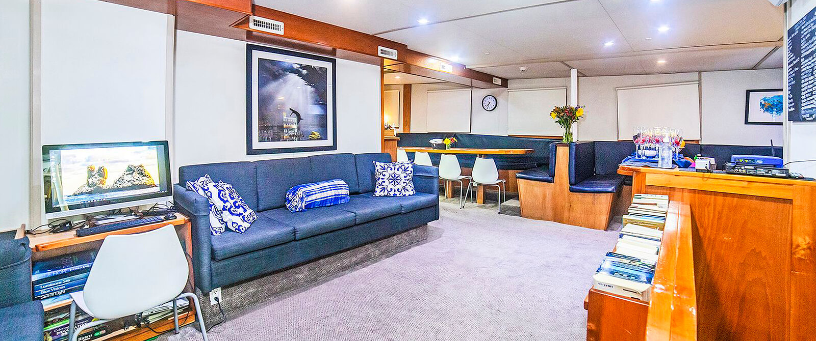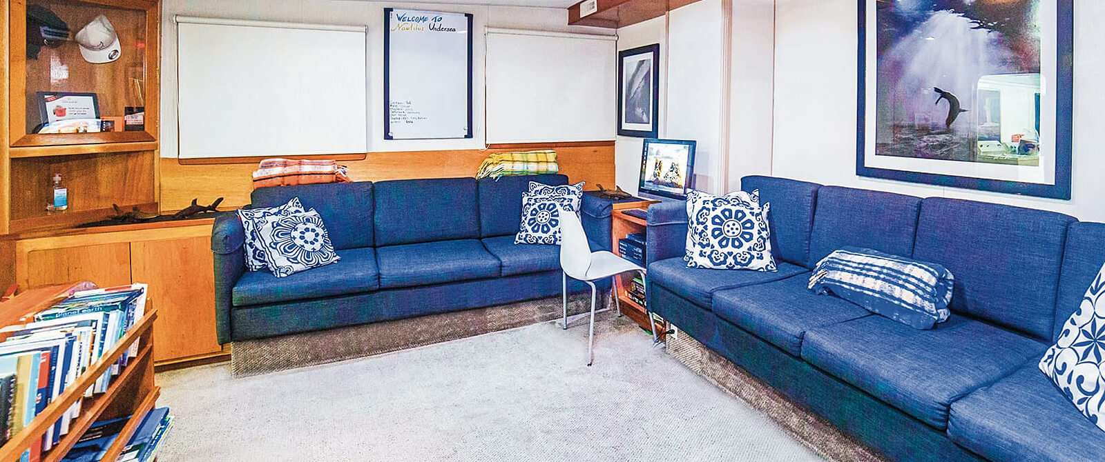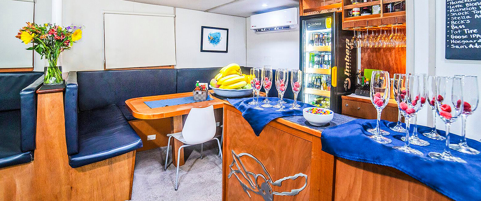 With 8 cabins, the Nautilus Under Sea can comfortably accommodate up to 18 guests. There are 6 Cabins on the Lower Deck, 5 have a Queen size bed and an optional, Single upper-bunk, and one room boasts two Bunk Beds. All of the Lower Deck cabins sport a single porthole. On the Main Deck you will find a Quadruple Room featuring 4 Bunk Beds. One Premium Suite can also be found on the Upper Deck and features a Queen-size bed with three portholes. In addition to the amenities mentioned above, each stateroom includes personal hanging lockers, en-suite bathrooms, air-conditioning and carpeted floors.
