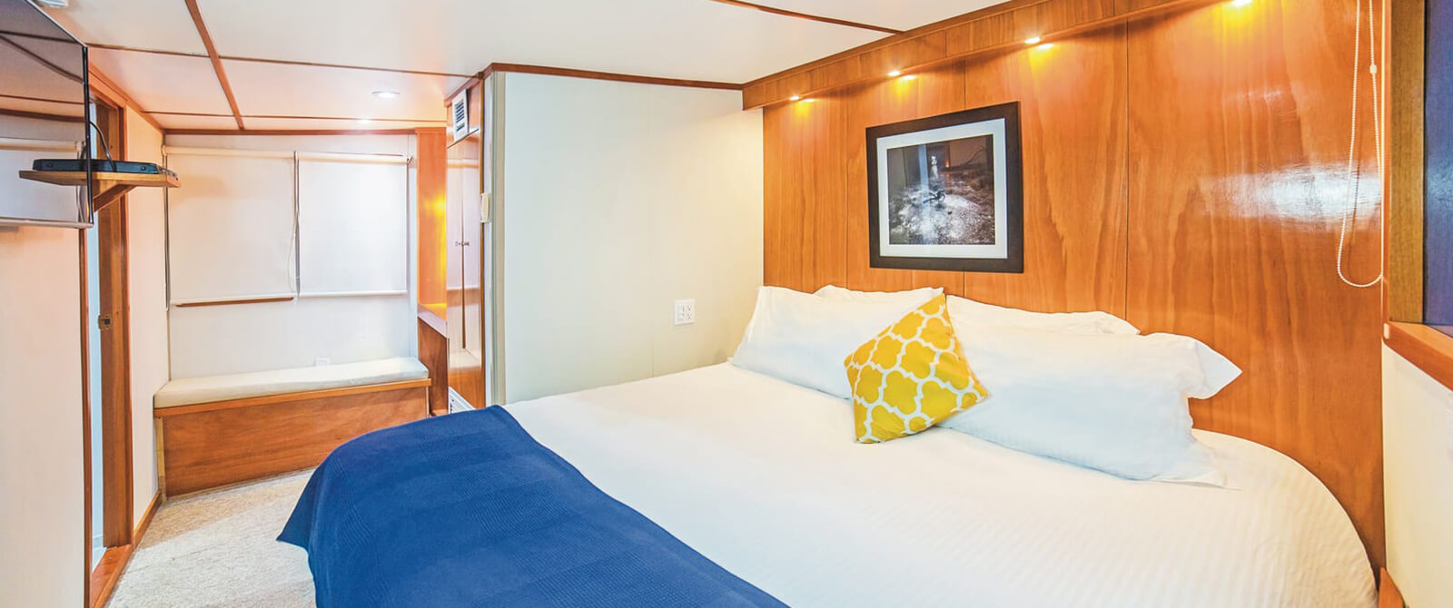 Cabin Emerald is a large Premium Suite on the sun deck and can be configured into two full beds or one large bed. Flat screen TV, multiple windows, ensuite, individually-controlled air conditioning, plenty of storage space and easy access to the hot tub.