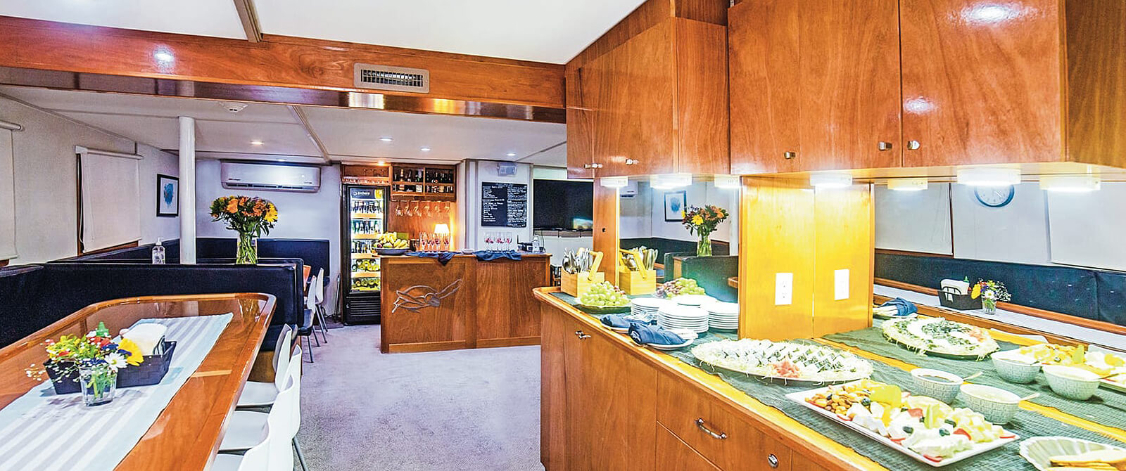 With 8 cabins, the Nautilus Under Sea can comfortably accommodate up to 18 guests. There are 6 Cabins on the Lower Deck, 5 have a Queen size bed and an optional, Single upper-bunk, and one room boasts two Bunk Beds. All of the Lower Deck cabins sport a single porthole. On the Main Deck you will find a Quadruple Room featuring 4 Bunk Beds. One Premium Suite can also be found on the Upper Deck and features a Queen-size bed with three portholes. In addition to the amenities mentioned above, each stateroom includes personal hanging lockers, en-suite bathrooms, air-conditioning and carpeted floors.
