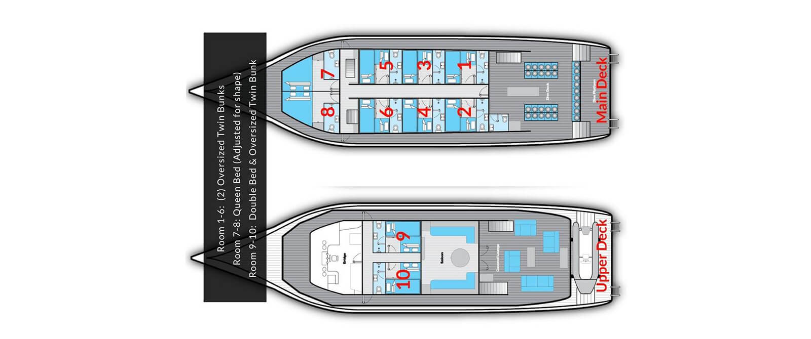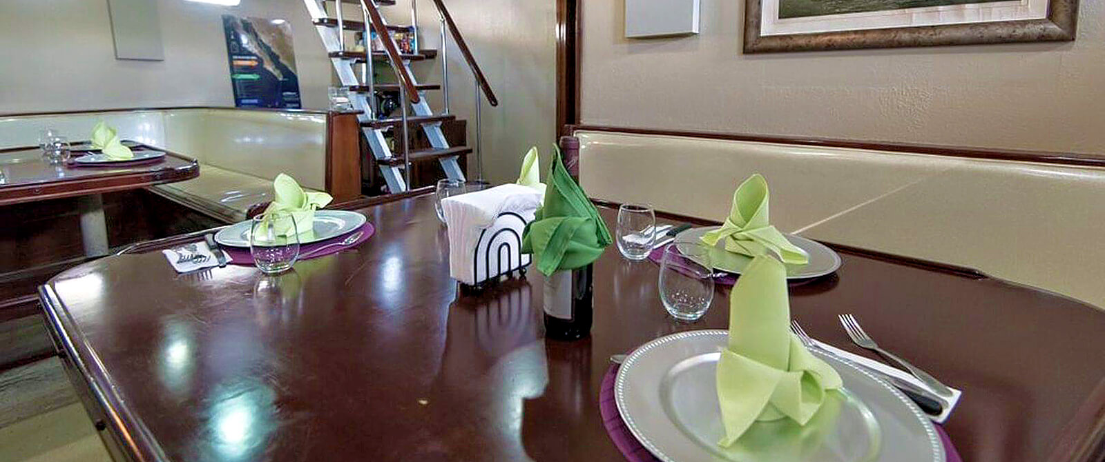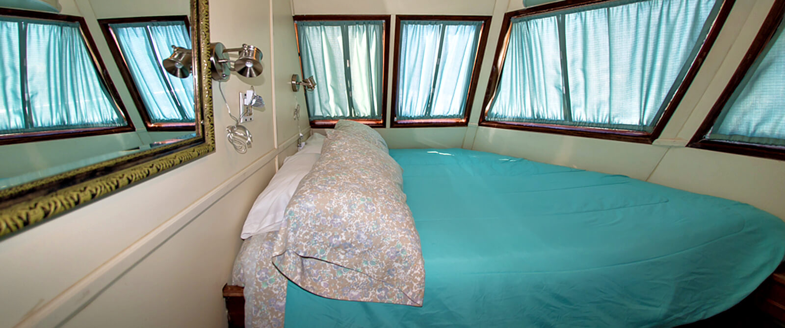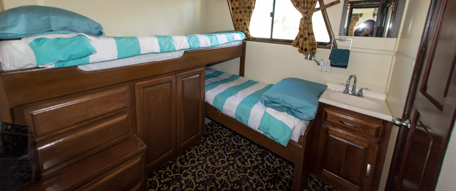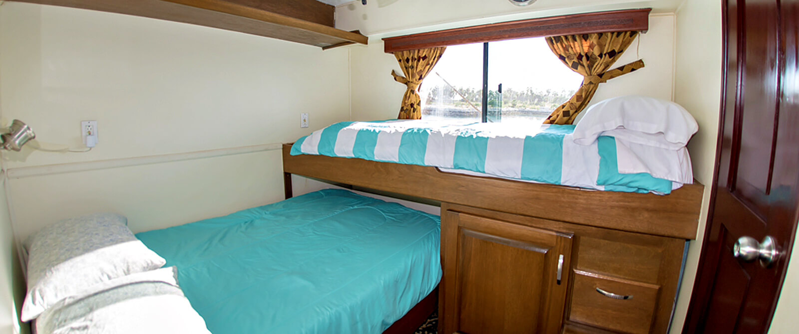 Six cabins feature two single beds with reading lights. Adjustable reading lights to focus the illumination without disturbing your cabin-mate. Each cabin is carpeted and air conditioned. There are room length windows with privacy curtains and convenient gear and clothes storage drawers beneath the beds.