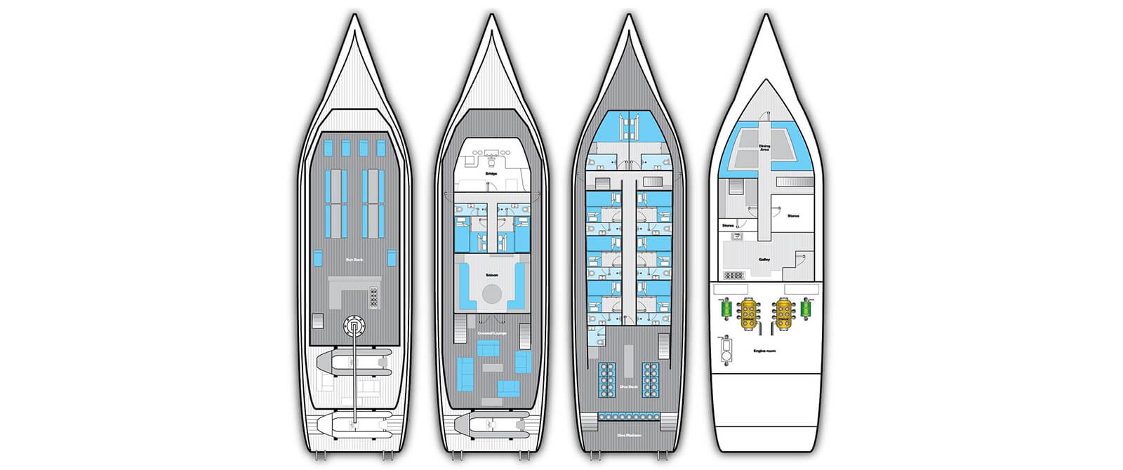 • The Quino el Guardian liveaboard is 90 ft long with a 25 ft beam, Quino holds room for 16 passengers with additional space for two of the group leaders in the crew quarters. 5 cabins: 4 cabins with 4 beds, each with with privacy curtains and a storage drawer for each guest. There is one cabin with 2 bunks that sleeps 2. There is air con throughout for everyone’s comfort.